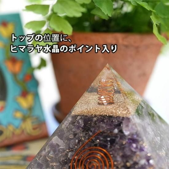 〜 強い浄化のエネルギーを持つ ヒマラヤ水晶のポイントとアメジストのチップが入った、ビッグサイズのオルゴナイトピラミッドです 〜