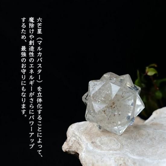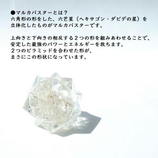 六角形の形をした、六芒星(ヘキサゴン・ダビデの星)を立体化したものがマルカバスターです。