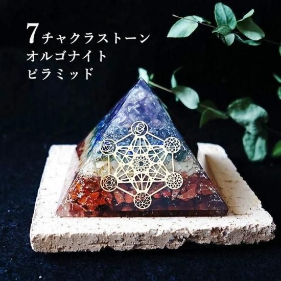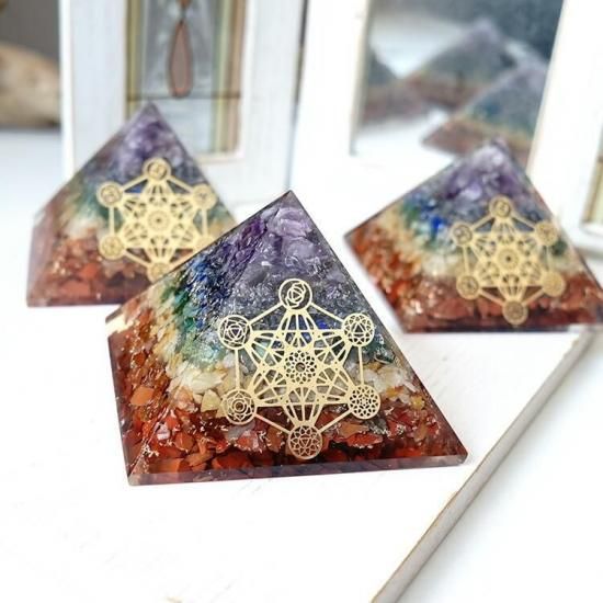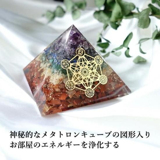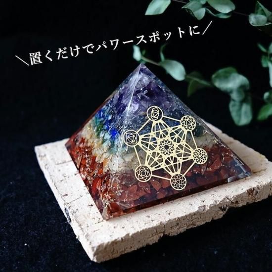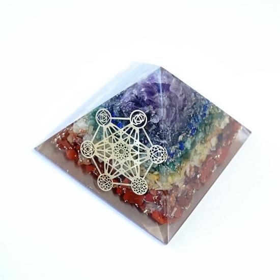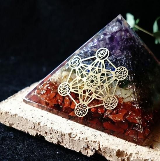 〜 神聖なる幾何学模様のメタトロンキューブの図形が描かれた セブンチャクラストーンのオルゴナイトピラミッドです 〜