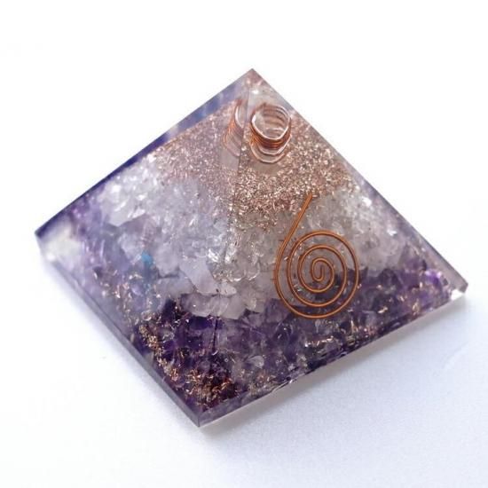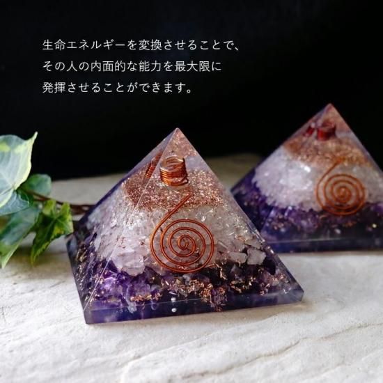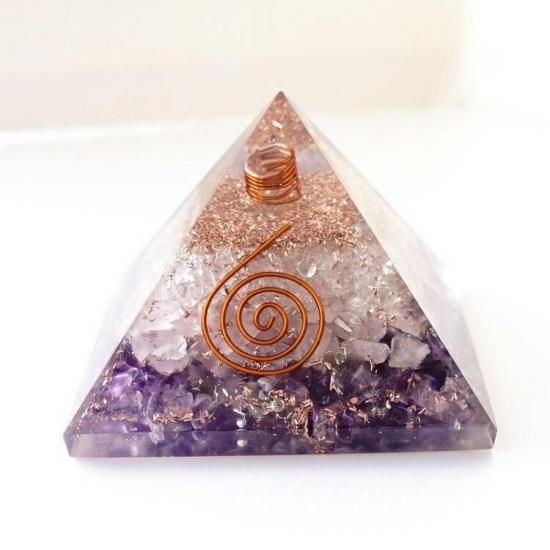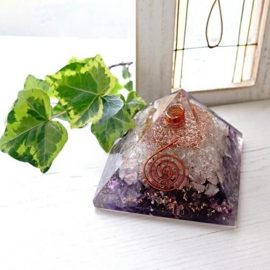 〜アメジストとローズクォーツのチップが入った、オルゴナイトのピラミッドです(ヒマラヤ水晶ポイント入り) 〜