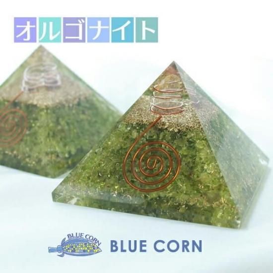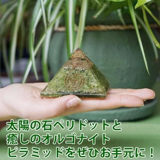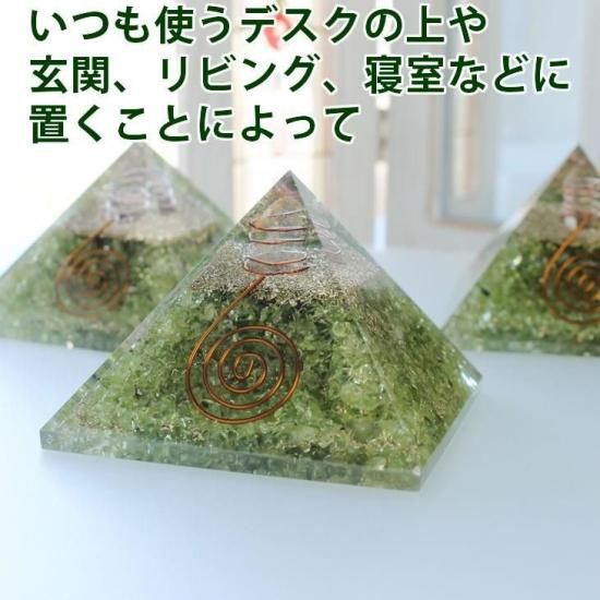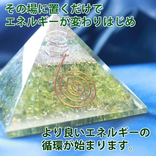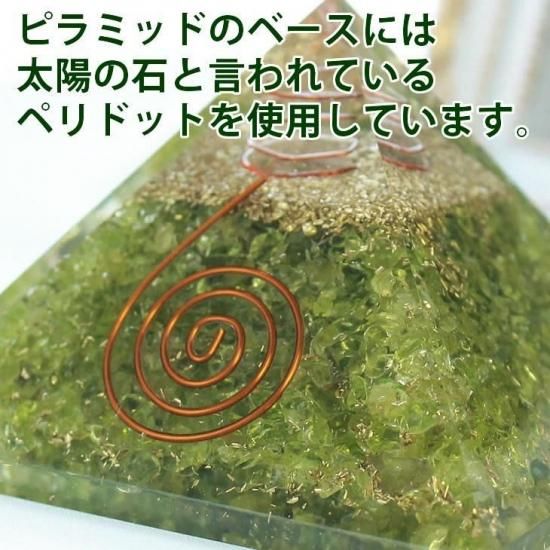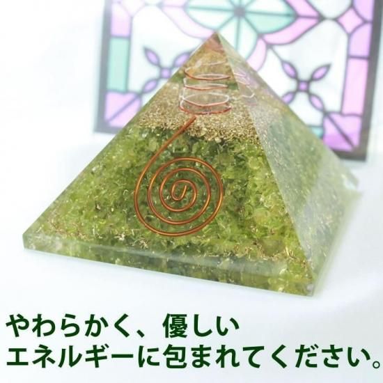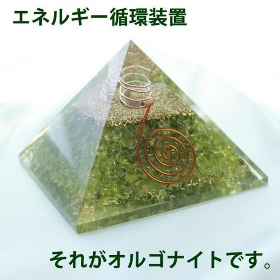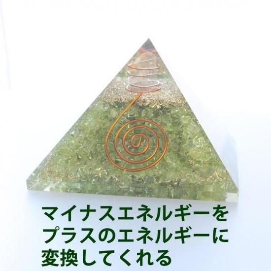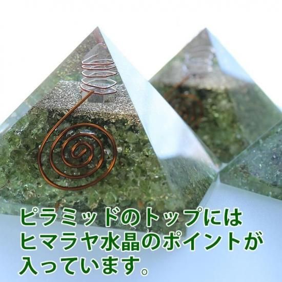 ヒマラヤ水晶のポイント入り ペリドットオルゴナイトピラミッドです! 〜