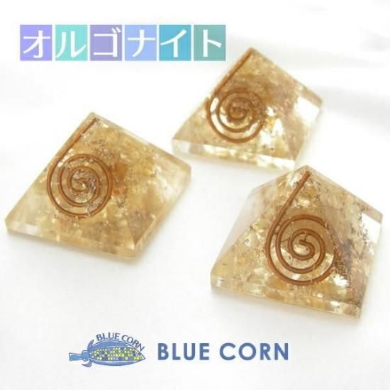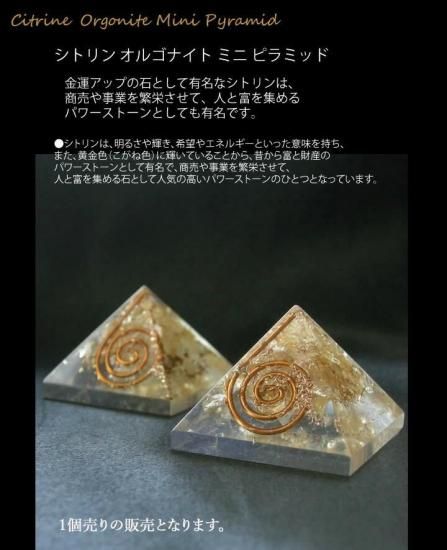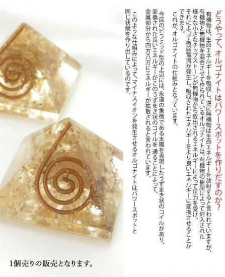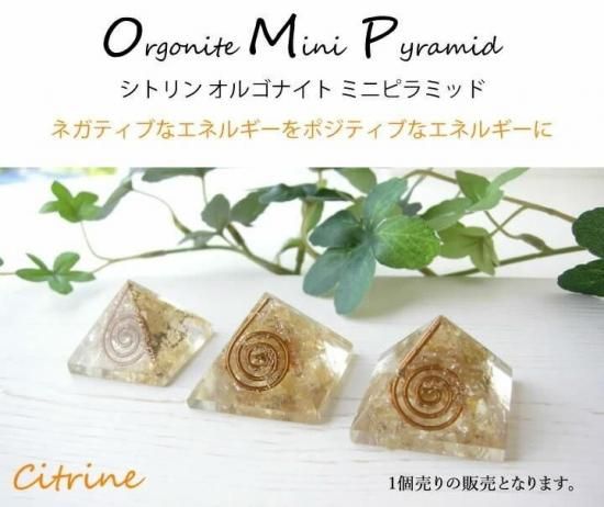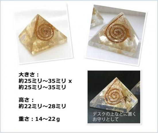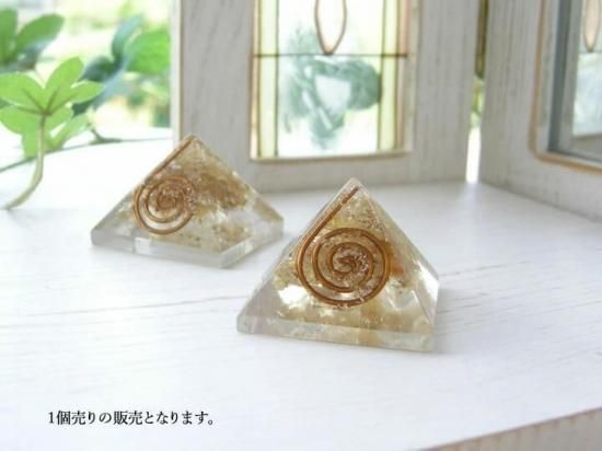 〜 マイナスのエネルギーをプラスのエネルギーに変える、シトリンのチップが入った、てのひらにものせることができる、オルゴナイトのミニピラミッドです 〜