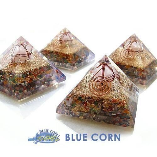 〜「幸運の星」という意味を持つ形をした ローズクォーツのマルカバスター入り!生命エネルギーをより良くする ミックスストーンのオルゴナイトピラミッドです 〜