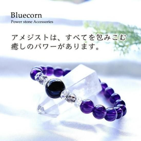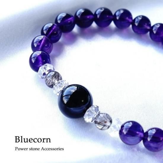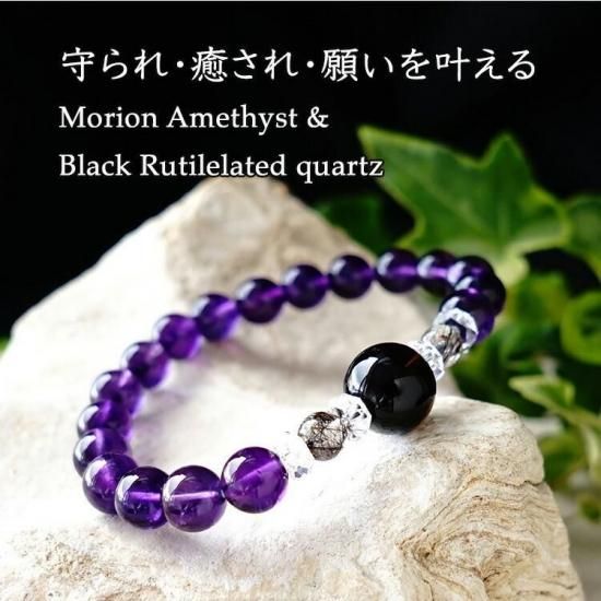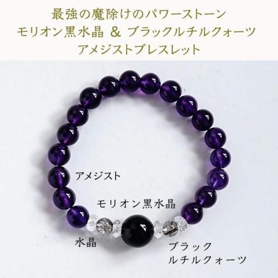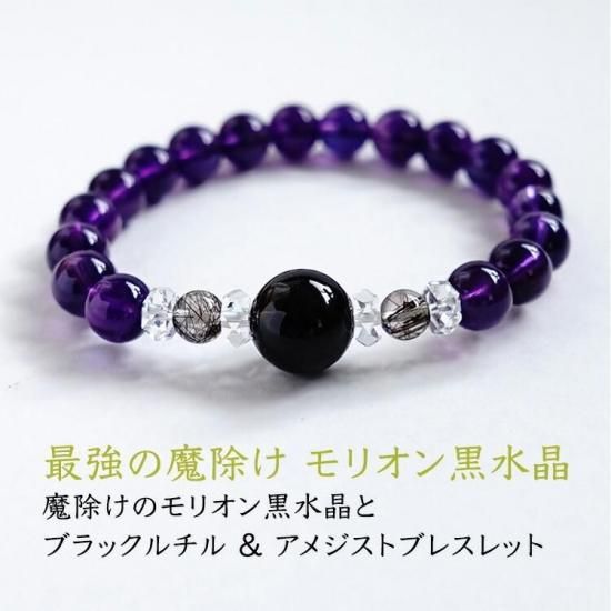 〜 最強の魔除けのパワーストーン モリオン黒水晶と金運・仕事運アップのブラックルチルクォーツ 癒しのアメジストのブレスレットです 〜
