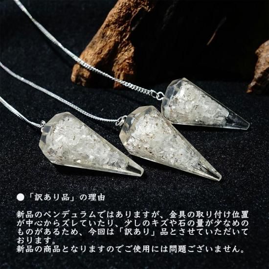 ◆訳ありの理由:新品のペンデュラムではありますが、金具の取り付け位置が中心からズレていたり、少しのキズや石の量が少なめのもの、レジンが付いてしまっている為、今回は「訳あり」品とさせていただいております。新品の商品となりますのでご使用には問題ございません。