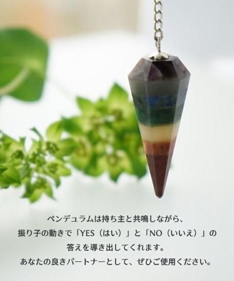 ペンデュラムは、持ち主と共鳴しながら、振り子の動きで「YES(はい)」と「NO(いいえ)」の答えを導き出してくれますので、あなたの良きパートナーとして、ぜひご使用ください。