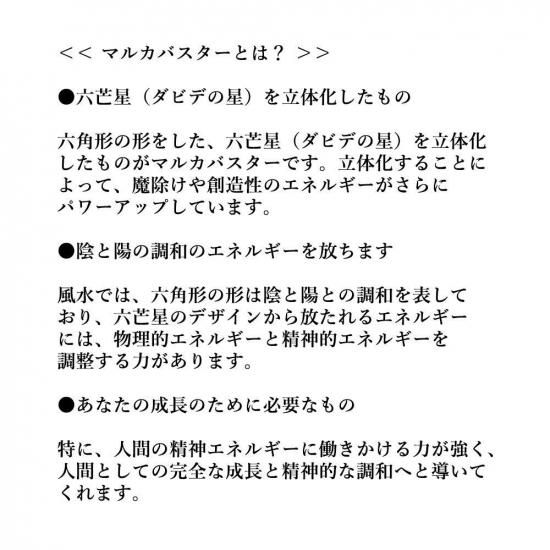 六角形の形をした、六芒星(ダビデの星)を立体化したものがマルカバスターです。立体化することによって、魔除けや創造性のエネルギーがさらにパワーアップしています。