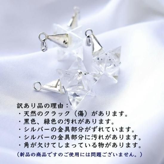 新品のマルカバスターペンダントトップではありますが、使用している石に天然のキズや天然のへこみ、天然の黒い模様や、天然の汚れ、シルバーの金具部分がずれていたり、汚れがあったり、マルカバスターの角が欠けてしまっている物があったりしたため、今回は「訳あり」品とさせていただいております。新品の商品となりますのでご使用には問題ございません。