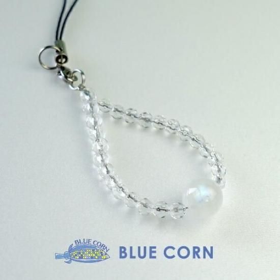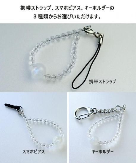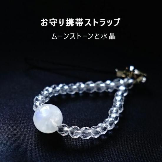 〜10ミリ球のムーンストーンと水晶を組み合わせた お守り携帯ストラップです。〜