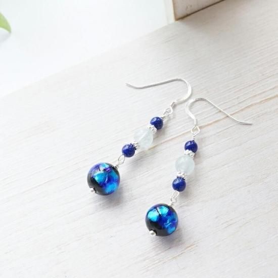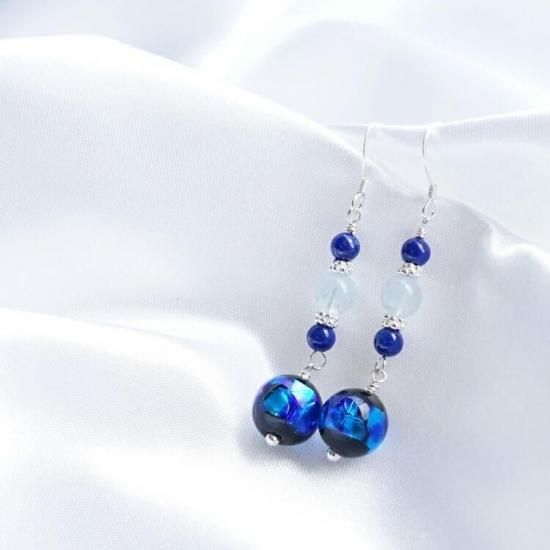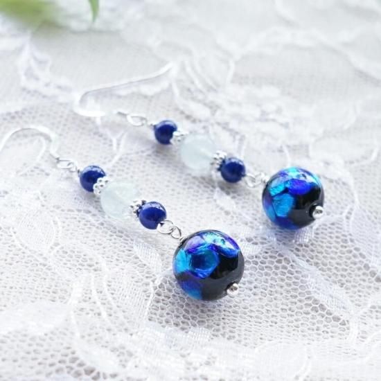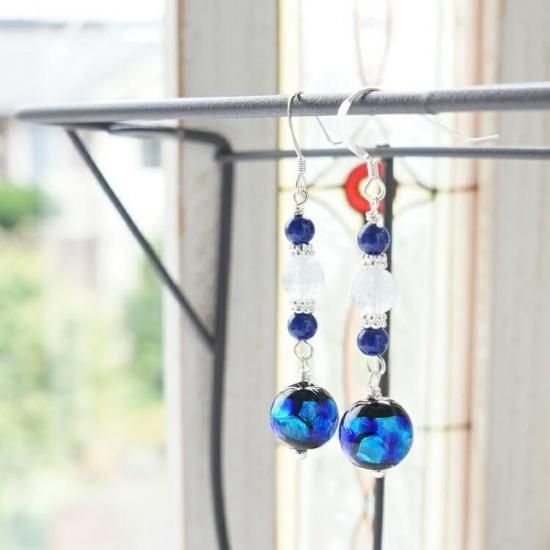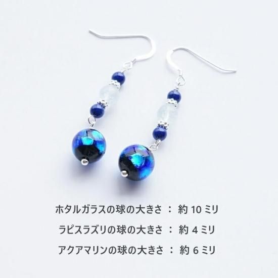 〜10ミリ球のホタルガラスと幸運のラピスラズリ、人生の最高のお守り石アクアマリンを組み合わせたピアスです!〜